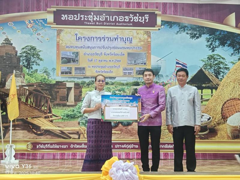 รายละเอียด : วันศุกร์ที่ 17 ตุลาคม 2568 เวลา 09.30 น. นายณรงค์ฤทธิ์ นาอ่อน นายกเทศมนตรีตำบลนิเวศน์ นายกมล ศิริเกตุ และ นางเพ็ญจิตร วังผือ รองนายกเทศมนตรีตำบลนิเวศน์ ร่วมสมทบทุนสนับสนุนการปรับปรุงซ่อมแซมหอประชุมอำเภอธวัชบุรี จังหวัดร้อยเอ็ด ณ หอประชุมอำเภอธวัชบุรี จังหวัดร้อยเอ็ด
