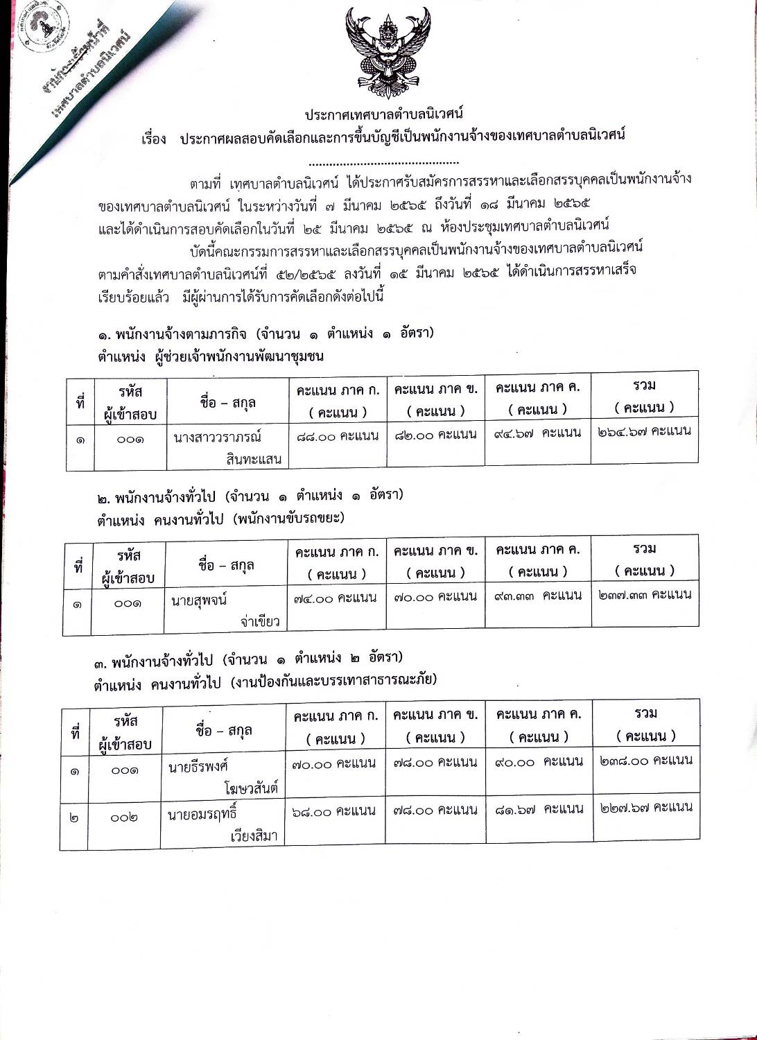 ประกาศผลสอบคัดเลือกและการขึ้นบัญชีเป็นพนักงานจ้างของเทศบาลตำบลนิเวศน์