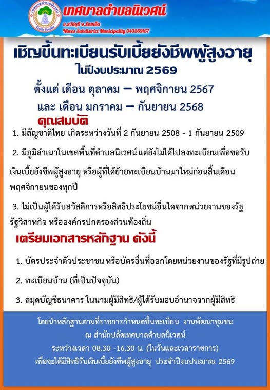 ประชาสัมพันธ์การขึ้นทะเบียนรับเบี้ยยังชีพผู้สูงอายุ ประจำปีงบประมาณ พ.ศ.2569